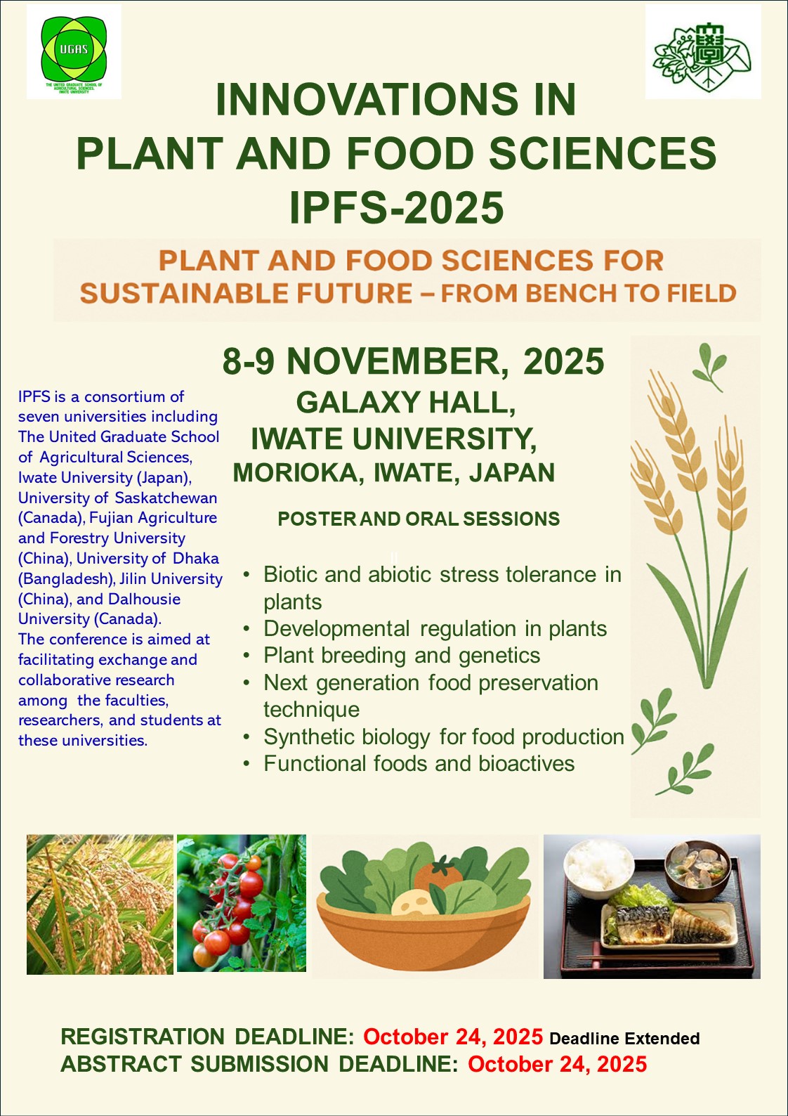 The United Graduate School of Agricultural Sciences (UGAS), Iwate University, is pleased to announce the international symposium “Innovations in Plant and Food Sciences (IPFS-2025)”. The symposium aims to strengthen partnerships with our consortium universities and to promote collaborative research and student exchange among participating institutions. The theme this year is “Plant and Food Sciences for a Sustainable Future – From Bench to Field.”